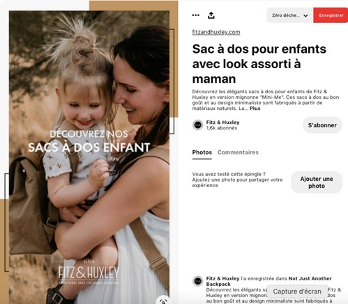 Plus vos épingles ont de l’engagement, plus Pinterest les valorisera. C’est pourquoi il est essentiel d’accorder de l’importance à vos visuels. Pour cela, nous vous conseillons d’avoir des visuels soignés. A ce stade-là, vous avez deux possibilités. La première est de mettre en avant uniquement des photos de vos produits, sans titre ni texte sur votre épingle (exemple du Mama Shelter). La seconde possibilité est d’utiliser un visuel avec du texte, écrit suffisamment gros pour qu’il soit visible et des polices faciles à lire avec des couleurs qui correspondent à votre identité visuelle (exemple de Fitz and Huxley ci-dessous)